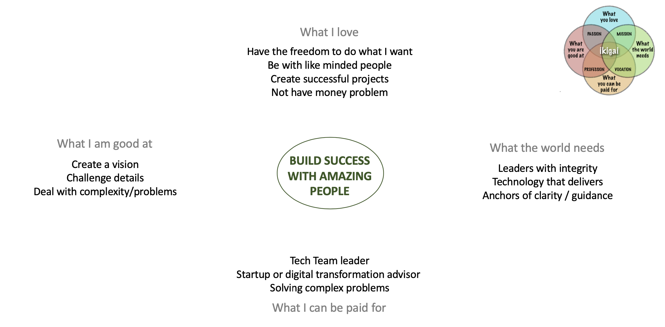 Then I gave them where I fit in the world, my Ikigai. It did not cost me more than 2min, because I had done it already more than a year ago. As a present, let me give you my Ikigai here below. I strongly encourage you to think hard about yours.