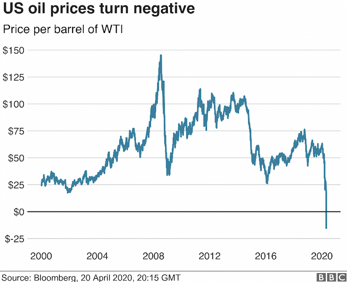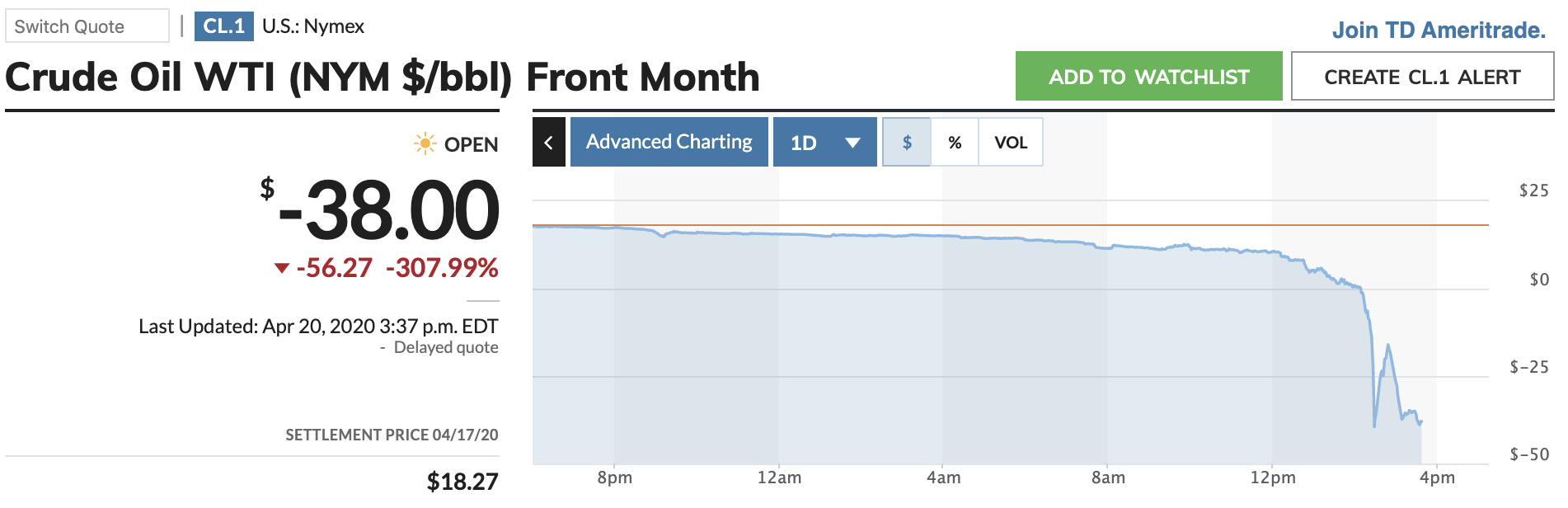 Oil price started the session at around $18, the lowest it has been in 20 years, an indication of opportunistic buys π€. And all of a sudden, it dropped and fell through the zero line, as if it was irrelevant. As a trader, if you bought oil at its cheapest of the past 20 years early in the morning, you would not only have lost all your money, but you would have lost 3 times your money before dinner got served. Because either you take delivery of all the barrels that you cannot store, or you lose 3 times your money, or you go bust. As a matter of fact, a few firms went bust before dinner...