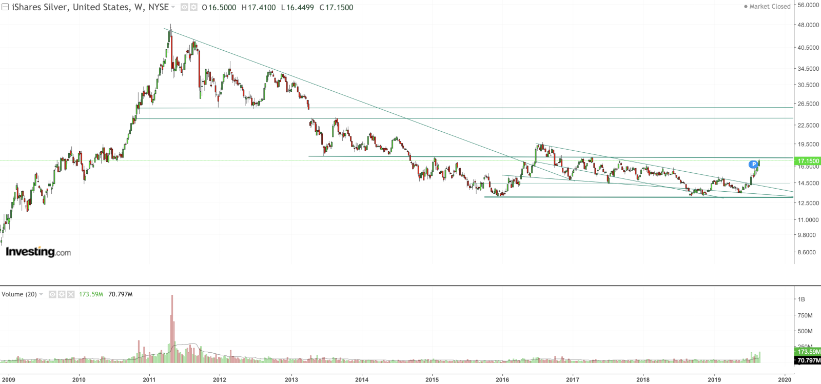 We can see in the graph above, two downward stages. A first steeper one took place from 2011 to 2016 and was broken on the upside mid-2016. This gave birth to another downward channel, less steep, more narrow, and shorter in duration from mid 2016 to mid 2019. Guess what, this downward channel got broken a mere few weeks ago.