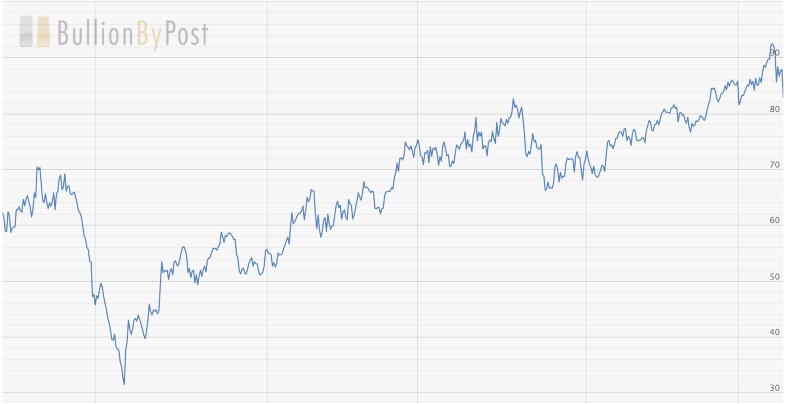 Over the past 10 years, the median ratio has been between 60-70. A recent ratio of 90 shouts very loudly that Silver is a cheaper insurance than Gold is.
