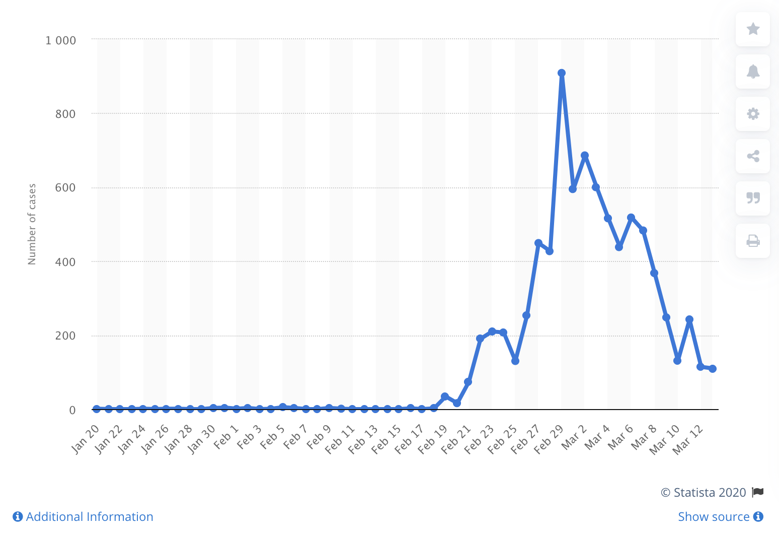 Current stage of the contamination: day 15. At day 15, South Korea's case were on the flat zero line. So was Italy.