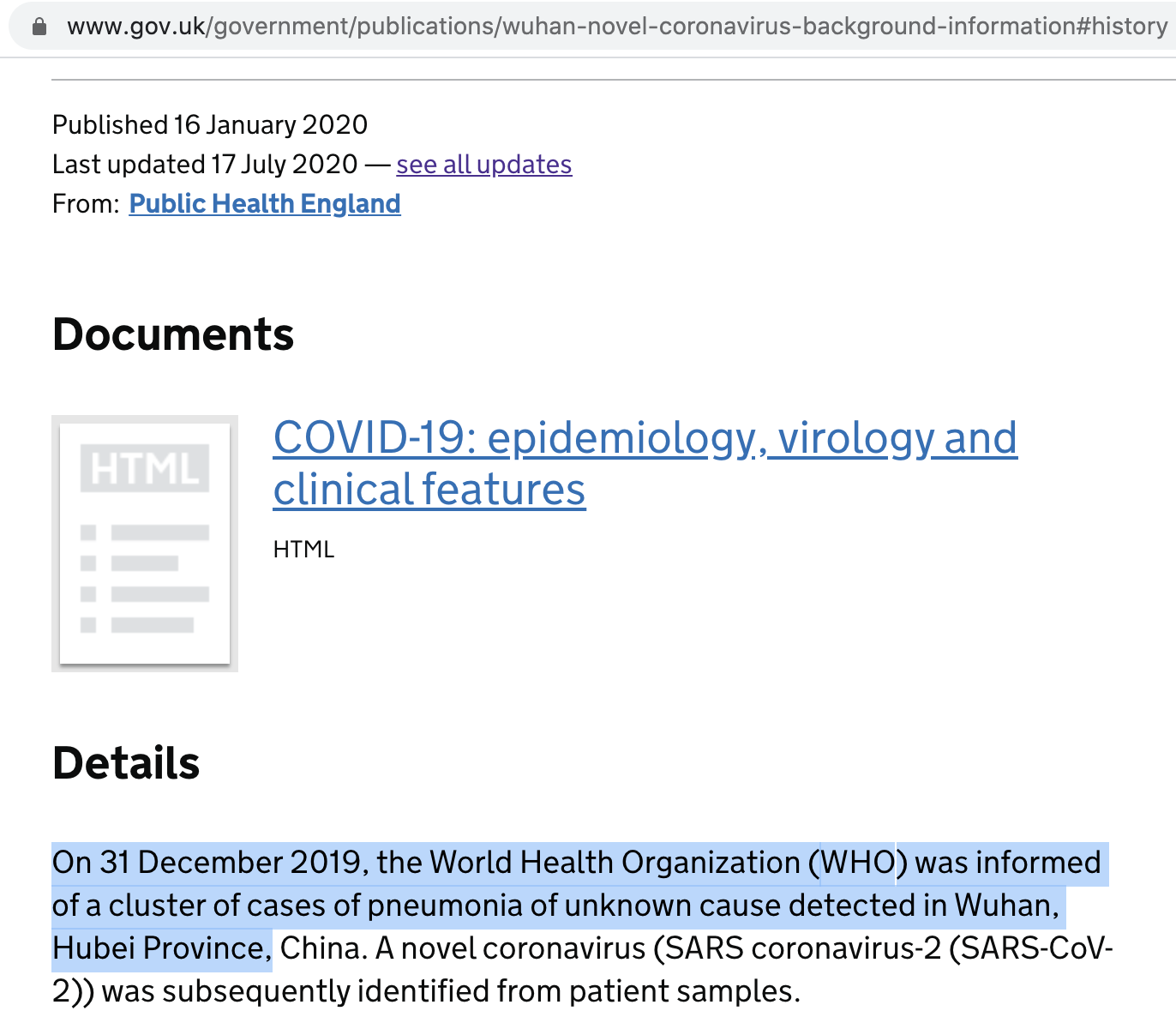 As we all know, and as as the UK gov made it very clear in an article published in Jan 2020, the first Covid 19 were first identified as cases of pneumonia of unknown cause detected in Wuhan, Hubei Province, China.