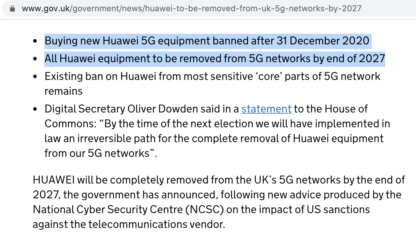 "The UK Government has decided to launch a program to remove all Huawei components from its Telecom infrastructure by 2027. Despite having found no evidence of Covid being transmitted by 5G, there is a strong link between the Huawei Research Center based in Wuhan and the origin of Covid19. Therefore, the UK Government has decided to take a cautious approach and not allow Chinese chips and electronics be deployed in its cities, to minimise the risk of transmitting Covid19. Save Lives! Protect the NHS!"
